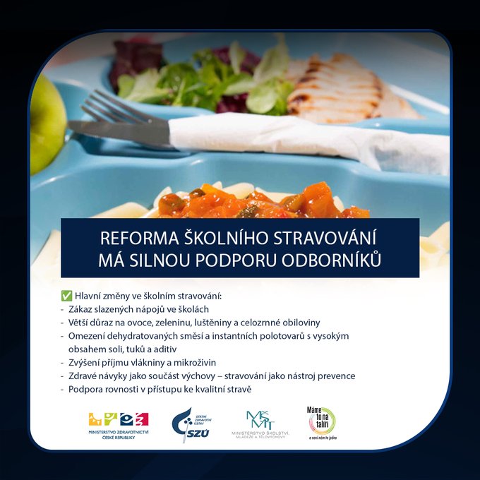 Zdroj: Ministerstvo zdravotnictví ČR – odkaz https://mzd.gov.cz/tiskove-centrum-mz/reforma-skolniho-stravovani-ziskava-silnou-podporu-odborniku-zmeny-vita-i-who-a-spicky-ceske-mediciny/