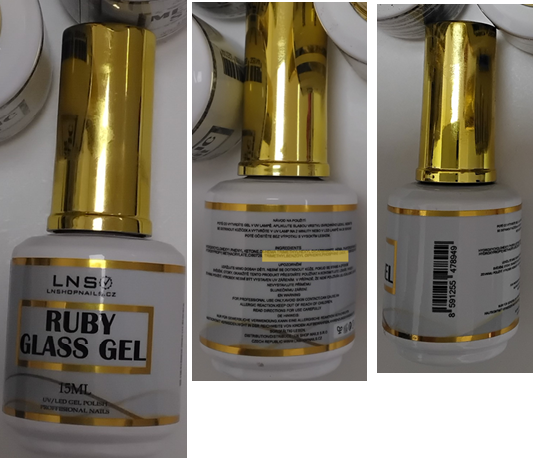 LNS, LNSHOPNAILS.CZ, RUBY GLASS GEL, 15ML, UV/LED GEL POLISH PROFFESIONAL NAILS 01, 12, 05; číslo šarže/ sp. do: neuvedeno; EAN: 8591255478949