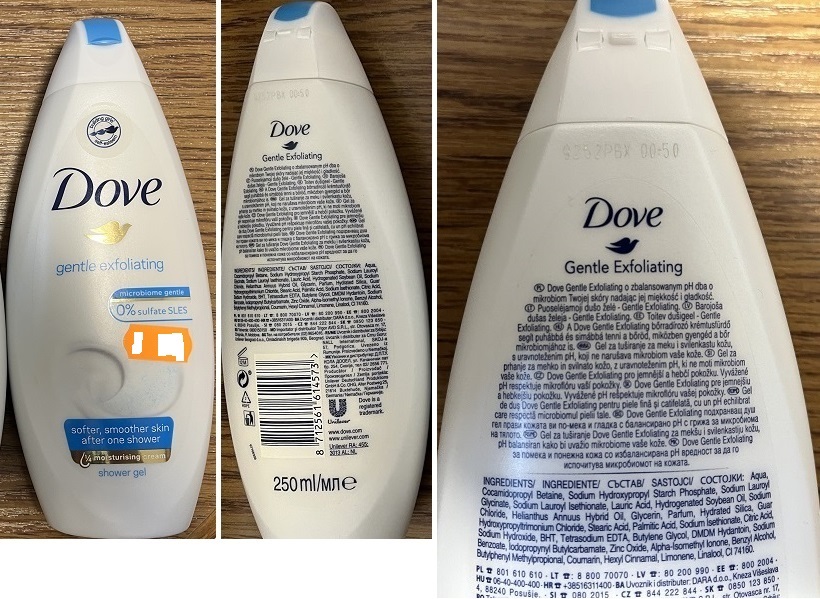 Dove, shower gel, gentle exfoliating, číslo šarže/ sp. do: 9252PBX 00:50, 67706309, EAN: 8712561614573